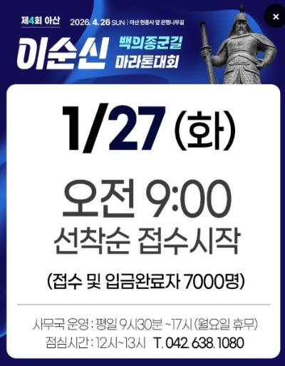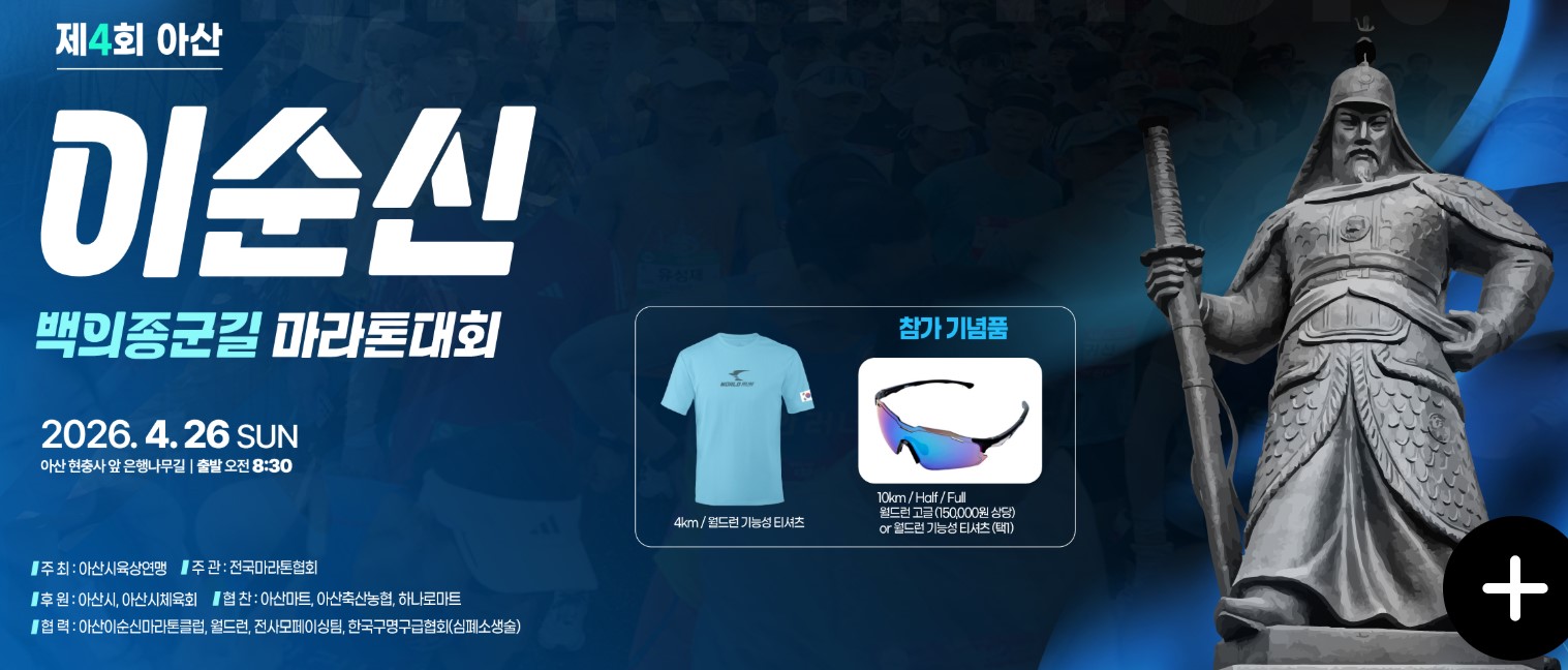 지금까지 마라톤을 단순한 달리기 대회로만 생각하셨다면, 이번 기회에 새로운 의미를 더해보세요. 역사와 자연, 그리고 도전이 어우러진 ‘2026 아산 이순신 백의종군길 마라톤대회’가 당신을 기다립니다. 단 하루, 단 한 번, 이 특별한 경험을 놓치지 마세요!