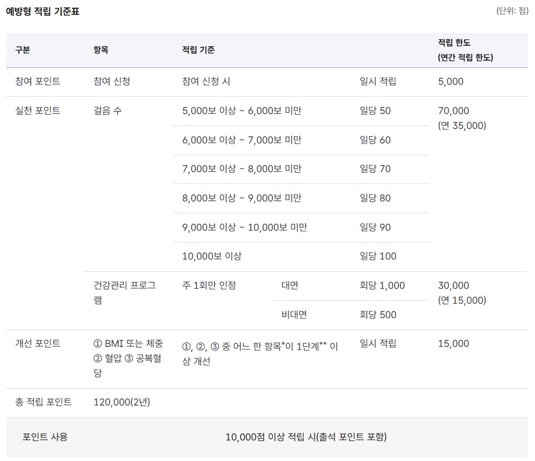| 건강관리 프로그램 | 주 1회(대면/비대면) | 회당 최대 1,000점 |