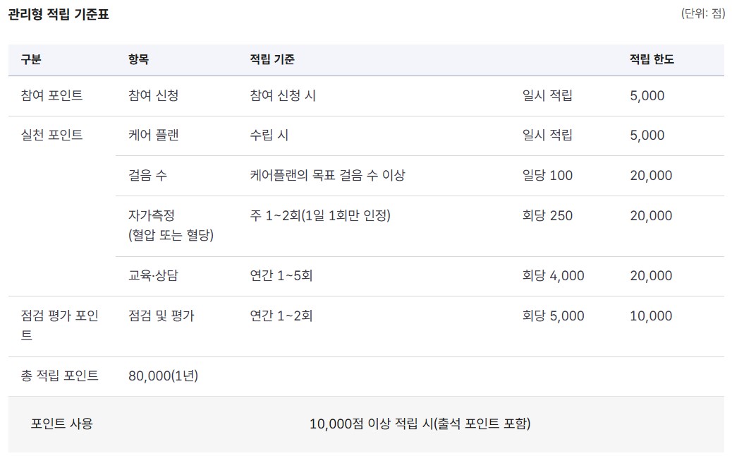 관리형 참여자는 케어플랜 수립 후, 걸음 수, 자가측정(혈압·혈당), 교육 참여 등으로 1년 최대 80,000점 적립 가능합니다.