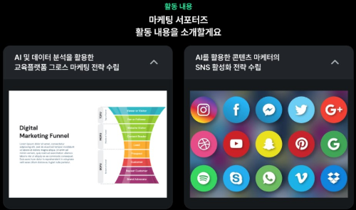 특히 ‘생성형 AI’ 기반 마케팅 실전 부트캠프가 개설되어 실무와 멘토링을 동시에 경험할 수 있는 기회!