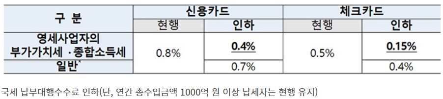 기존 신용카드 수수료는 0.8%였으나 0.7%로 인하되며, 영세사업자의 경우에는 신용카드 납부 시 0.4%p 인하로 무려 50%까지 경감됩니다.