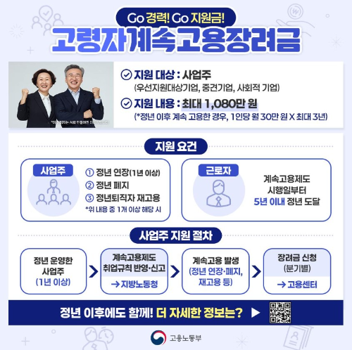 이제는 ‘퇴직 후 백수’가 아니라, ‘퇴직 후 현역’이 가능한 시대입니다. 고령자 계속고용장려금 제도를 통해 보다 많은 시니어가 일할 수 있고, 기업도 고령 인력의 노하우를 활용할 수 있습니다. 가족 중 60세 이상 근로자가 있다면, 꼭 알려주세요. 지금이 바로 신청할 때입니다!