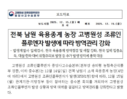 2025년 12월 14일, 전라북도 남원시에 위치한 육용종계 농장(사육 규모: 약 4만 마리)에서 고병원성 조류인플루엔자(HPAI) 확진이 발생했습니다.