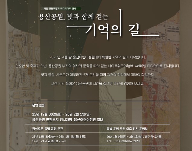 2026년 2월 1일까지 매주 금~일요일 오후 5시부터 9시까지, ‘빛과 함께 걷는 기억의 길’이라는 미디어아트 프로그램이 운영됩니다. 조명, 영상, 사운드가 결합된 체험형 콘텐츠로, 과거 용산의 역사를 조명하고 현대적 감각으로 재해석한 프로그램입니다.